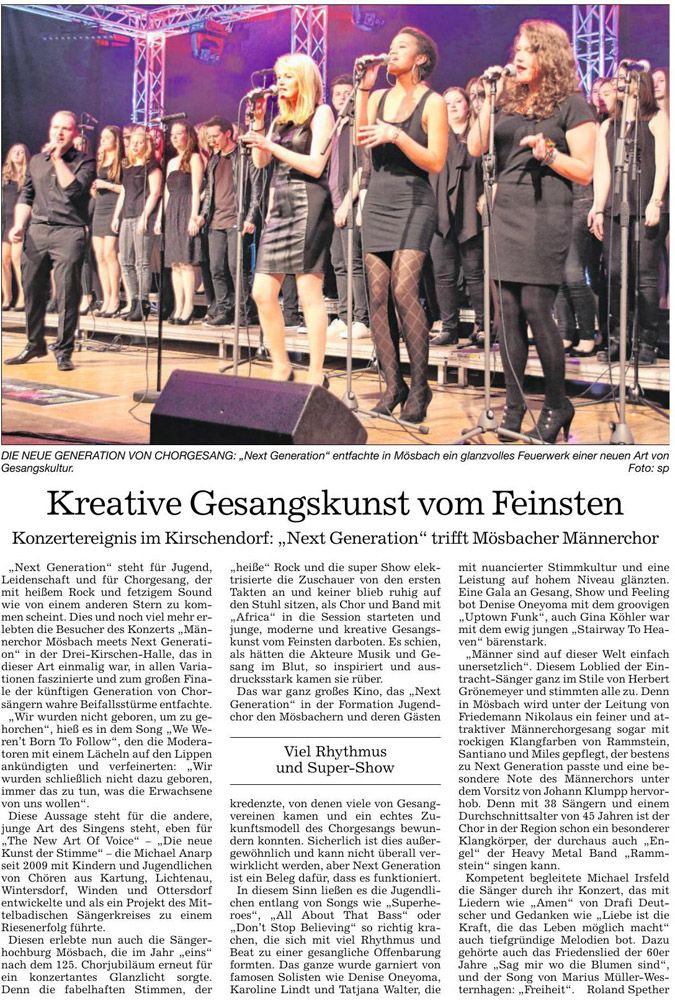 „Next Generation“ steht für Jugend, Leidenschaft und für Chorgesang, der mit heißem Rock und fetzigem Sound wie von einem anderen Stern zu kommen scheint. Dies und noch viel mehr erlebten die Besucher des Konzerts „Männerchor Mösbach meets Next Generation“ in der Drei-Kirschen-Halle, das in dieser Art einmalig war, in allen Variationen faszinierte und zum großen Finale der künftigen Generation von Chorsängern wahre Beifallsstürme entfachte.